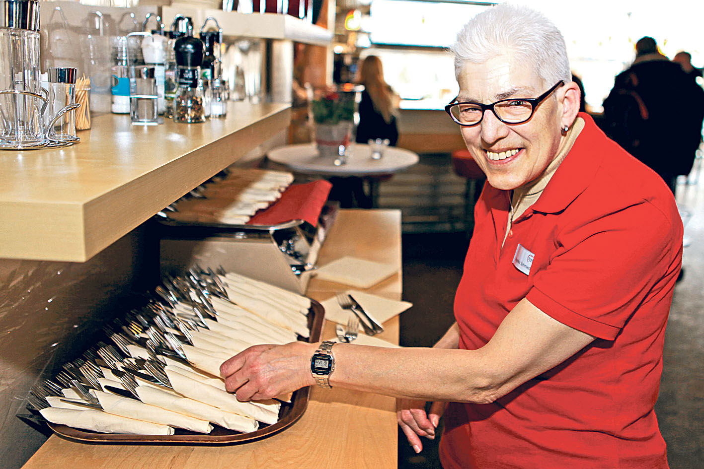 Mit großer Sorgfalt rollt Angelika Schmieder Messer und Gabel in eine Serviette ein, dann deckt sie die Tische für die Gäste. Schmieder, die als Kind bereits epileptische Anfälle bekam, arbeitet fünf Tage in der Woche vier Stunden in Bethels Freizeit- und Kulturzentrum „Neue Schmiede“ der v. Bodelschwinghschen Stiftungen. Die 62-Jährige liebt ihre Arbeit: „Ich brauche Menschen um mich.“ Sie ist seit über 30 Jahren in Bethel. „Ich wollte auf eigenen Füßen stehen, deshalb bin ich hierher gekommen“, erzählt sie. In Bethel lebt sie selbstständig in einer Wohnung. Wenn sie Hilfe braucht, kann sie Pflegekräfte herbeirufen.