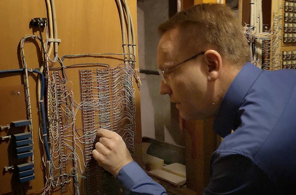 Hinzu kommt, dass die Orgel in den 1970er-Jahren elektrifiziert wurde – nach mehr als 40 Jahren sind nun die verlegten Kabel marode, bei jedem Spiel fliegen die Funken. „Das Schlimmste, was passieren kann, ist ein Schwelbrand“, erklärt der Kantor: Die Kabel und elektrischen Widerstände sind ohne Isolierung auf Sperrholztafeln gelötet, daher die Brandgefahr. Um größtmögliche Sicherheit zu gewährleisten, wurde nicht nur ein Sicherheitsschalter eingebaut, der das Instrument im Ruhezustand vom Stromnetz trennt, sondern es steht auch stets ein Feuerlöscher griffbereit, wenn der Organist in die Tasten greift. „Wenn etwas akut ausfällt, hilft uns ein befreundeter Elektroniker im Ruhestand“, sagt der Organist.