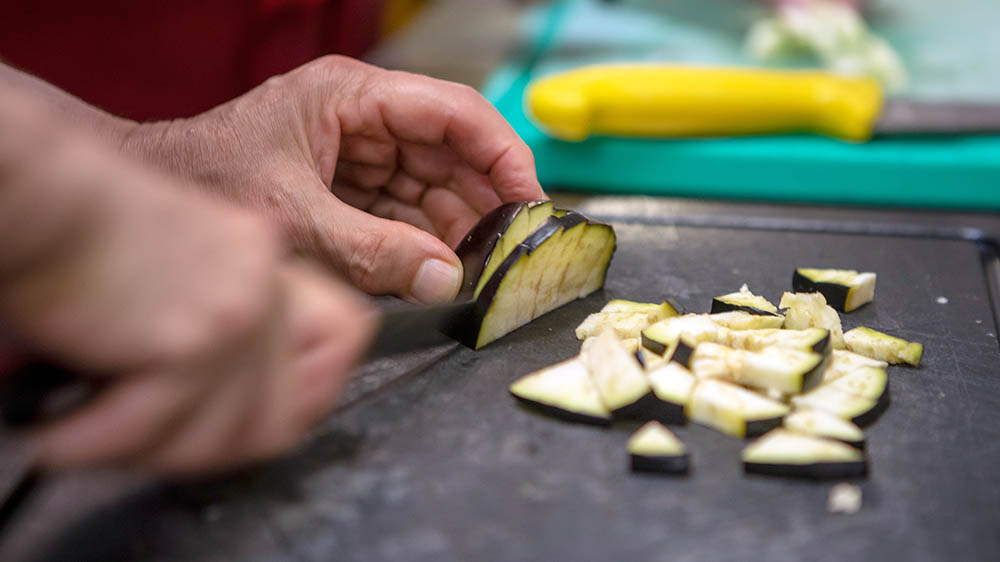 Auch für Heidi, 70, ist der Kochabend ein Weg aus der Einsamkeit. „Ich finde es gut, dass wir hier etwas zusammen machen und nicht nur reden“, erzählt sie, während sie Auberginen für die Gemüselasagne in kleine Stücke schneidet. Früher hat ihr Mann, der vor zwei Jahren gestorben ist, jeden Abend gekocht. Jetzt sollen die Mahlzeiten für sie vor allem schnell gehen: „Ich esse nicht gerne allein.“