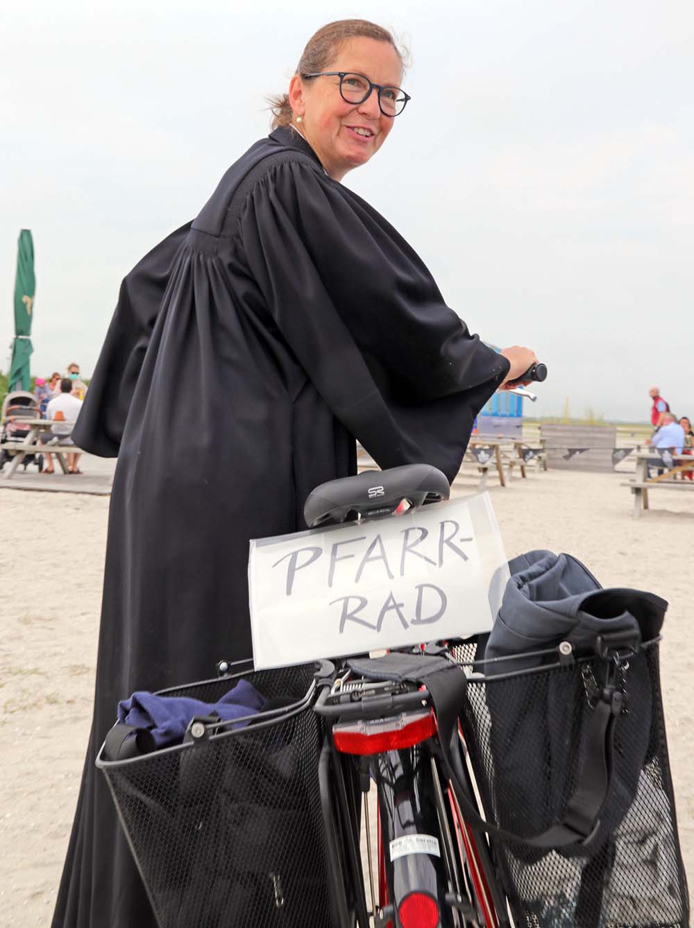 Viele Gäste und Einheimische kennen Karola Wehmeier seit Jahren. “Wenn ich wieder im Norden bin, miete ich mir als erstes ein Fahrrad.” Daran befestigt sie dann ein Schild mit der Aufschrift “PFARR-RAD” und ihrer Handynummer. Dazu der Hinweis: “Zeit für Dich – Reden über Gott und die Welt oder das, was Dir am Herzen liegt.” Einen weiteren laminierten Zettel mit ihrer Nummer legt sie in den Kirchen-Strandkorb. “Viele Menschen nutzen das Angebot.”
