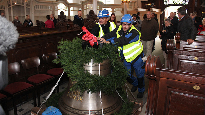 Mit einem Kran wurden die Glocken in die Kirche gehievt, wo sie zunächst an einem Holzgerüst knapp über dem Kirchenboden hängen. Der Turm muss für ihre Aufhängung noch eigens verstärkt werden. Dafür wird in 106 Metern Höhe eine Konstruktion mit sechs neun Meter langen Stahlträgern eingezogen. Erst im Januar sollen die Glocken im Turm hängen.
