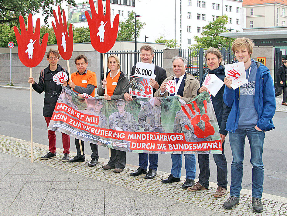 Vertreter mehrerer Hilfsorganisationen haben Bundesverteidigungsministerin Ursula von der Leyen (CDU) aufgefordert, die Rekrutierung und Werbung von Minderjährigen für die Bundeswehr zu stoppen. Zum Abschluss der Kampagne „Unter 18 Nie“ überreichten sie der Ministerin in Berlin mehr als 30 000 Unterschriften. Gerade in den vergangenen Monaten seien Vorfälle bekannt geworden, die zeigten, „dass die Bundeswehr, wie alle anderen Armeen, kein Ort für Minderjährige ist“, sagte Ralf Willinger als Sprecher des „Deutschen Bündnisses Kindersoldaten“, einem Zusammenschluss von zehn Organisationen. Es sei „höchste Zeit, dass die Bundesregierung das Rekrutierungsalter auf 18 Jahre anhebt sowie auf Werbung bei Minderjährigen verzichtet“. Die Kampagne wurde von mehr als zehn Organisationen getragen, darunter die Kindernothilfe, terre des hommes, World Vision, Pax Christi und die Gewerkschaft Erziehung und Wissenschaft. Die meisten von ihnen sind auch im Deutschen Bündnis Kindersoldaten vereint.