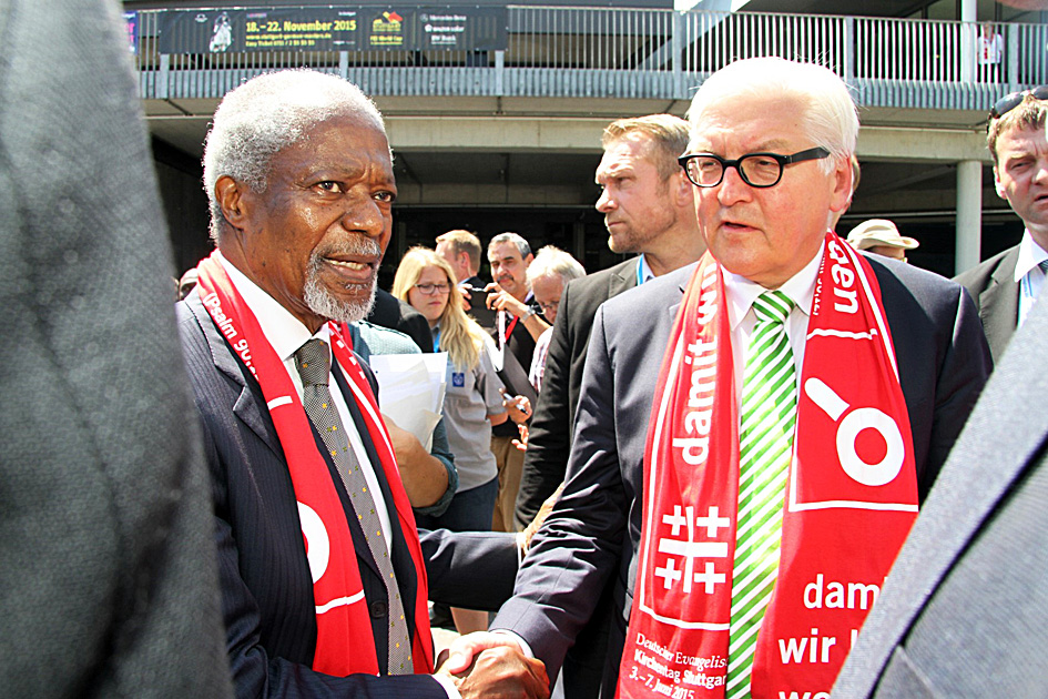 Der frühere UN-Generalsekretär Kofi Annan forderte in Stuttgart eine humanitäre Flüchtlingspolitik. Das Zuwanderungsproblem könne nicht einfach mit höheren Zäunen oder einer Politik der Abschottung gelöst werden. Migration könne nicht gestoppt werden. Deutschland sei in dieser Frage vergleichsweise offen und habe viele Migranten aufgenommen, die vor Gewalt und Armut geflohen seien: „Ich bitte Sie dringend, diesen Weg der Menschlichkeit weiterzugehen“, sagte Annan.