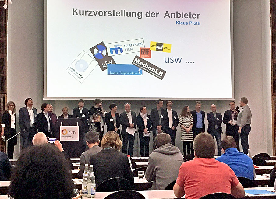 Die Hupe des Moderators ist unerbittlich: Nach jeweils 90 Sekunden unterbricht sie die Kurzvorstellung der Filmverlage. Das muss reichen, um die Besonderheiten der jeweiligen Angebote zu präsentieren, denn es gibt ja die Möglichkeit, an den Ständen im Foyer des Tagungshauses ausführlicher miteinander ins Gespräch zu kommen.