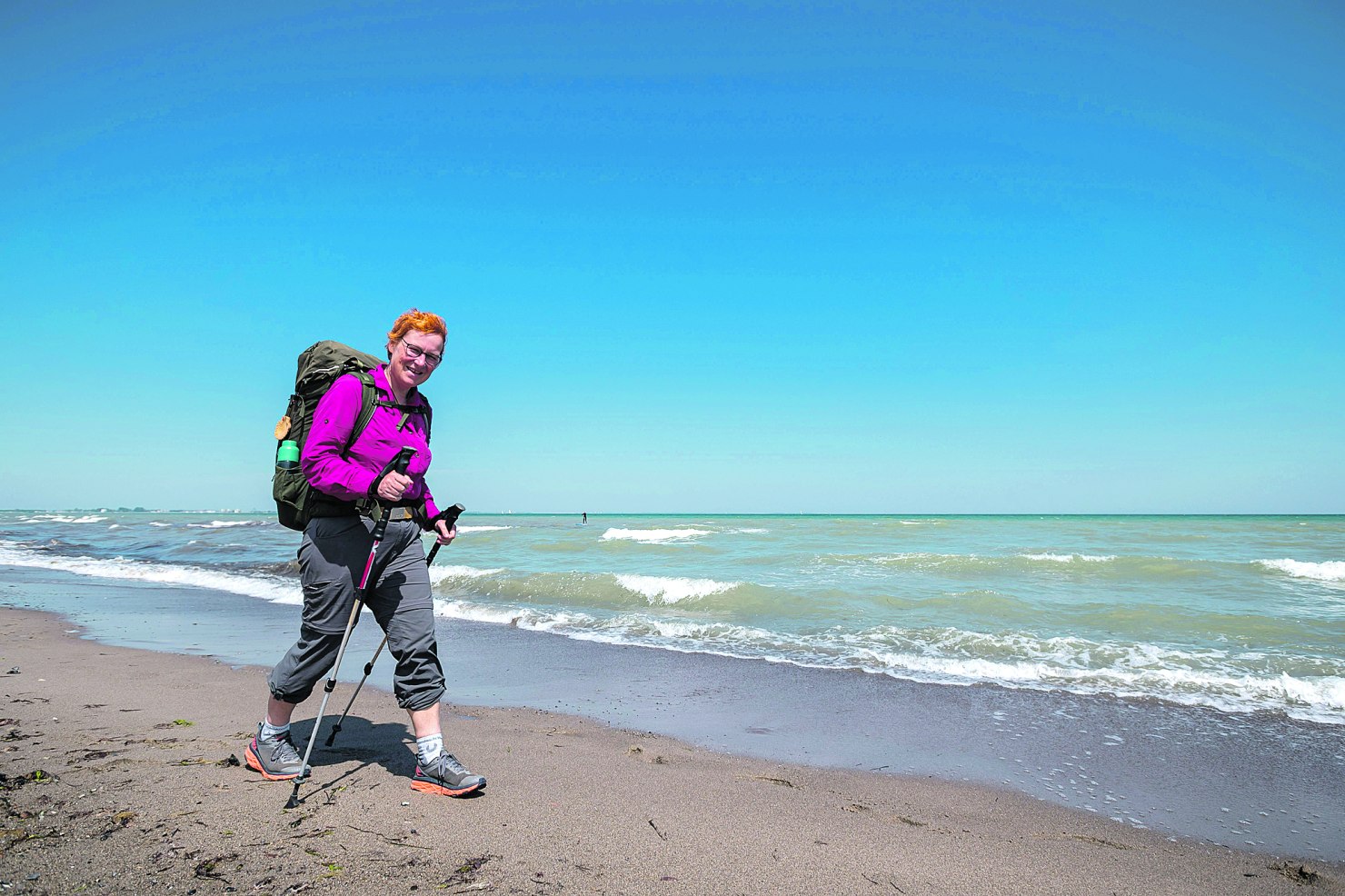 Felice Meer blickt durch das Restaurantfenster in Richtung Ostsee. Während die meisten Gäste im Freien Kaffee und Kuchen genießen, hat sie für einen Moment drinnen ihre Ruhe. „Ich bin ja Tag und Nacht draußen, anders als die meisten“, sagt die 56-Jährige. Gleich will sie sich wieder auf den Weg machen, zu Fuß über die Insel Fehmarn auf einem Pilgerweg, der sie bis ins norwegische Trondheim führen soll.