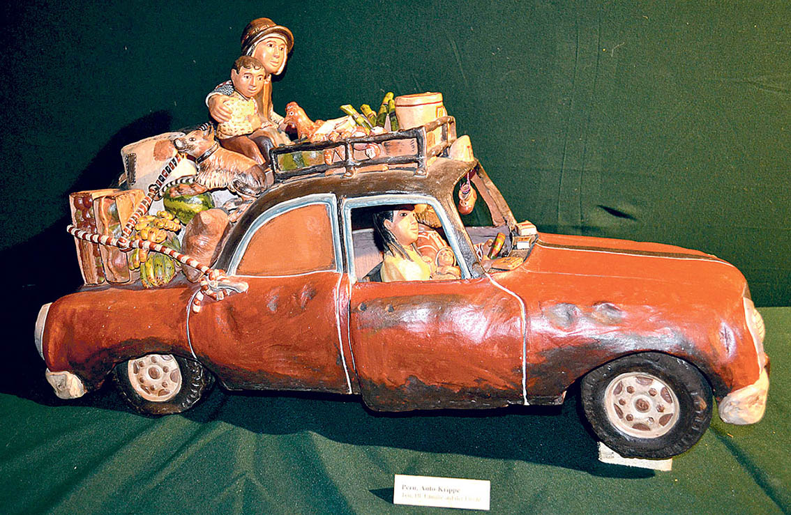 Aus Peru stammen die Retablos, mittelgroße, verzierte Kästen, hinter deren Flügeltüren sich die meist aufwändig und bunt gestaltete Krippenlandschaft verbirgt. Eine andere peruanische Krippe zeigt die heilige Familie in der Kleidung der Einheimischen auf Herbergssuche in einem voll gepackten Straßenkreuzer mit Tabak und Musikkassette.