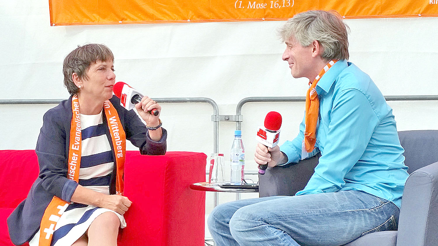 Hier nehmen sie alle gerne Platz: Stars, Prominente und überhaupt interessante Leute. Das „Rote Sofa“ der Kirchenpresse ist eine echte Attraktion auf dem Kirchentag