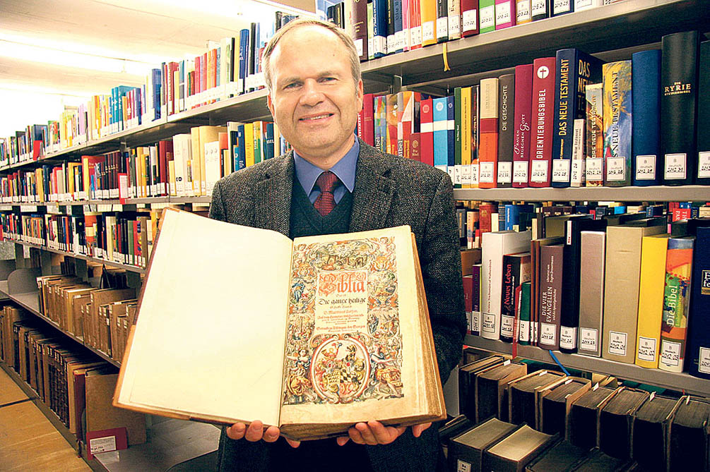 „Ich habe da ein schönes Stück mit Landesbezug.“ Zielsicher geht Abteilungsleiter Christian Herrmann durch die vollen Regale im Archiv der Landesbibliothek Württemberg und greift nach einem großen Buch mit schmuckem Ledereinband. Die Zeit hat ihre Spuren hinterlassen, und doch ist der Band gut in Schuss. „Das ist die erste Lutherbibel, die in Württemberg für Württemberg gedruckt wurde, und zwar 1591 in Tübingen.“ Und nicht nur das: Es ist das Handexemplar von Herzog Ludwig von Württemberg, „dem Frommen“. Die Holzschnitte sind prachtvoll koloriert, die Seiten mit Goldschnitt verziert, Titelblatt, Handschrift und Porträt des Herzogs schmücken die ersten Seiten. „Ein Unikat“, sagt Herrmann.