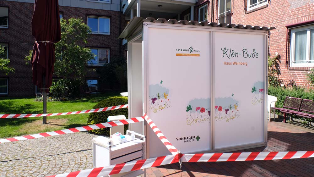 Hamburg (epd). Eine "Klön-Bude" für Heimbewohner und Angehörige ist von der Ev. Stiftung "Das Rauhe Haus" in Hamburg eröffnet worden. Die türlose Hütte mit zwei Zugängen, einer Trenn-Glasscheibe und einem schrägen Wellblechdach ermöglicht ab sofort persönliche Treffen mit ausreichendem "Corona-Sicherheitsabstand". Auf jeder Seite gibt es eine kleine Fensterbank mit Blumentopf.