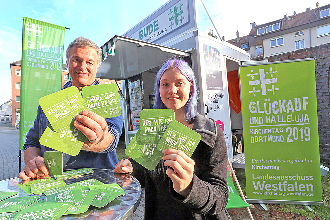 Die Dortmunder wollen an ihrer Bude mit speziellen Bierdeckeln zu verschiedenen Aktionen aufrufen. 100 000 Bierdeckel sind dafür produziert worden – mit einladenden Ruhrgebietssprüchen wie „Ker, wie ich mich freu!“, „Hömma, schön datte da biss!“, „Hier bisse genau richtich!“ Im Ruhrgebiet sei ja auch der Humor zu Hause, sagt Losse. „Wir hoffen, dass sich das auf die Kirchentagsbesucher überträgt.“