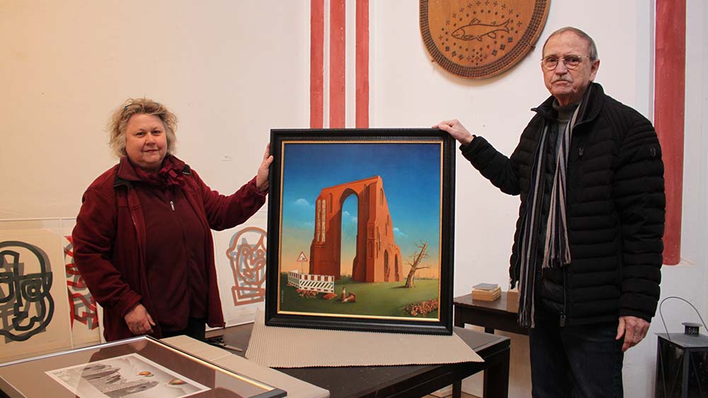 Also warf sie alles um. Das Thema der Ausstellung in Lassan aber blieb: memento mori – der Totentanz. „Ich dachte zunächst, es wäre schwierig. Aber viele Künstlerinnen und Künstler meldeten sich.“ Das Thema wurde weit gefasst: Da gibt es Fotografien aus den Katakomben von Paris, großflächige Karikaturen, Porträtzeichnungen von Sterbenden, Zeichnungen von Kirchenruinen und Hünengräbern, Bilder zum Ukrainekrieg.