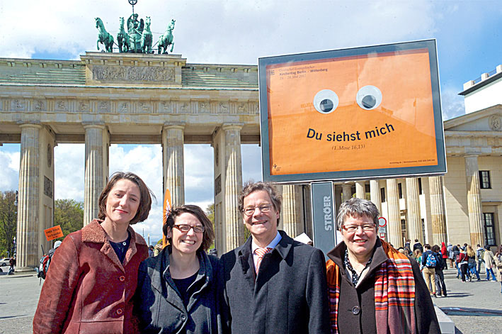 Berlin – Zwei große Augen zusammen mit der Losung „Du siehst mich“ auf orangefarbenem Hintergrund – damit werben die Protestanten für den Deutschen Evangelischen Kirchentag 2017 in Berlin und Wittenberg. Der Kirchentag soll „ein Lächeln in die Welt tragen“, hieß es. Kirchentagspräsidentin Christina Aus der Au präsentierte vergangenen Montag in Berlin zusammen mit dem Berliner Bischof Markus Dröge, der mitteldeutschen Bischöfin Ilse Junkermann und Kirchentagsgeneralsekretärin Ellen Ueberschär die Plakatkampagne vor dem Brandenburger Tor.