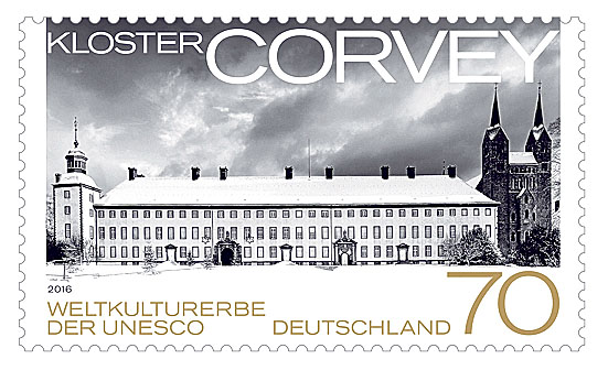 Anlass für die Auflage der Briefmarke ist die Aufnahme des Karolingischen Westwerks und der ehemaligen Klostersiedlung, Civitas Corvey, in die Weltkulturerbe-Liste der Unesco. Es ist die erste westfälische Stätte, die diese hohe Anerkennung erhielt. Die UN-Kulturorganisation hatte 2014 die Entscheidung über die ehemalige Benediktinerabtei mit dem berühmten Westwerk bekanntgegeben.