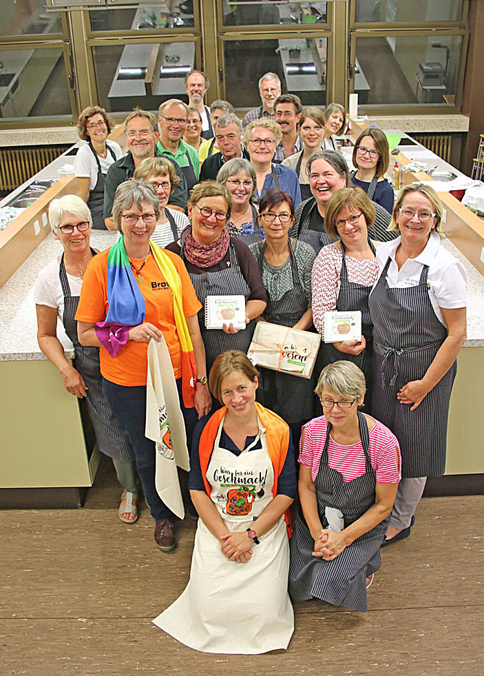 Die Pfarrerinnen Kirsten Potz und Katja Breyer haben dafür Koch Gerald Brunnert gewonnen, der schon in den 1980er Jahren in Haus Ortlohn vegetarisch und vollwertig gekocht hat. Mitte September fand der erste Kochevent in der Schulküche des Reckenberg-Berufskollegs in Rheda-Wiedenbrück statt. 20 Frauen und Männer haben zwei Stunden lang in vier Gruppen geschält, gerupft, gebrutzelt, gemixt und schließlich 13 verschiedene Gerichte probiert – von der Vorspeise bis zum Dessert.