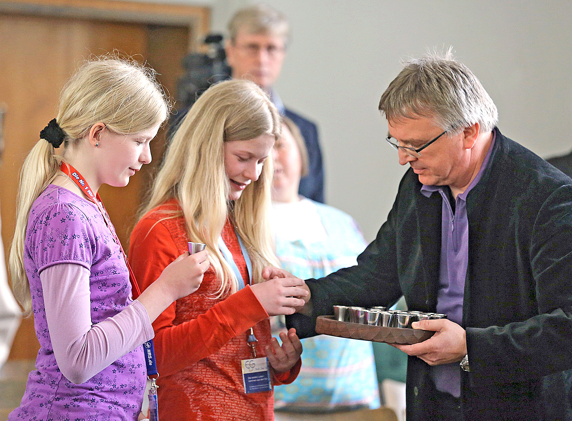 Plötzlich ist es ganz still in der Kirche. Obwohl eine bunte Gemeinde aus Erwachsenen und Kindern an diesem Gottesdienst teilnimmt, könnte man eine Stecknadel fallen hören. Im großen Kreis stehen alle um den Altar, von dem die Pfarrerin gesagt hat, dass es der Tisch des Herrn ist, an den nun alle eingeladen sind. Zuvor hatte sie in der Predigt vom letzten Abendmahl Jesu mit seinen Jüngern erzählt. Mit dem Auftrag Jesu, dies zu seinem Gedächtnis zu tun, verband sie die Einladung, zur Feier des Abendmahls nach vorne zu kommen und beim Teilen von Brot und Traubensaft an Jesus, seine Worte und sein Tun zu denken.