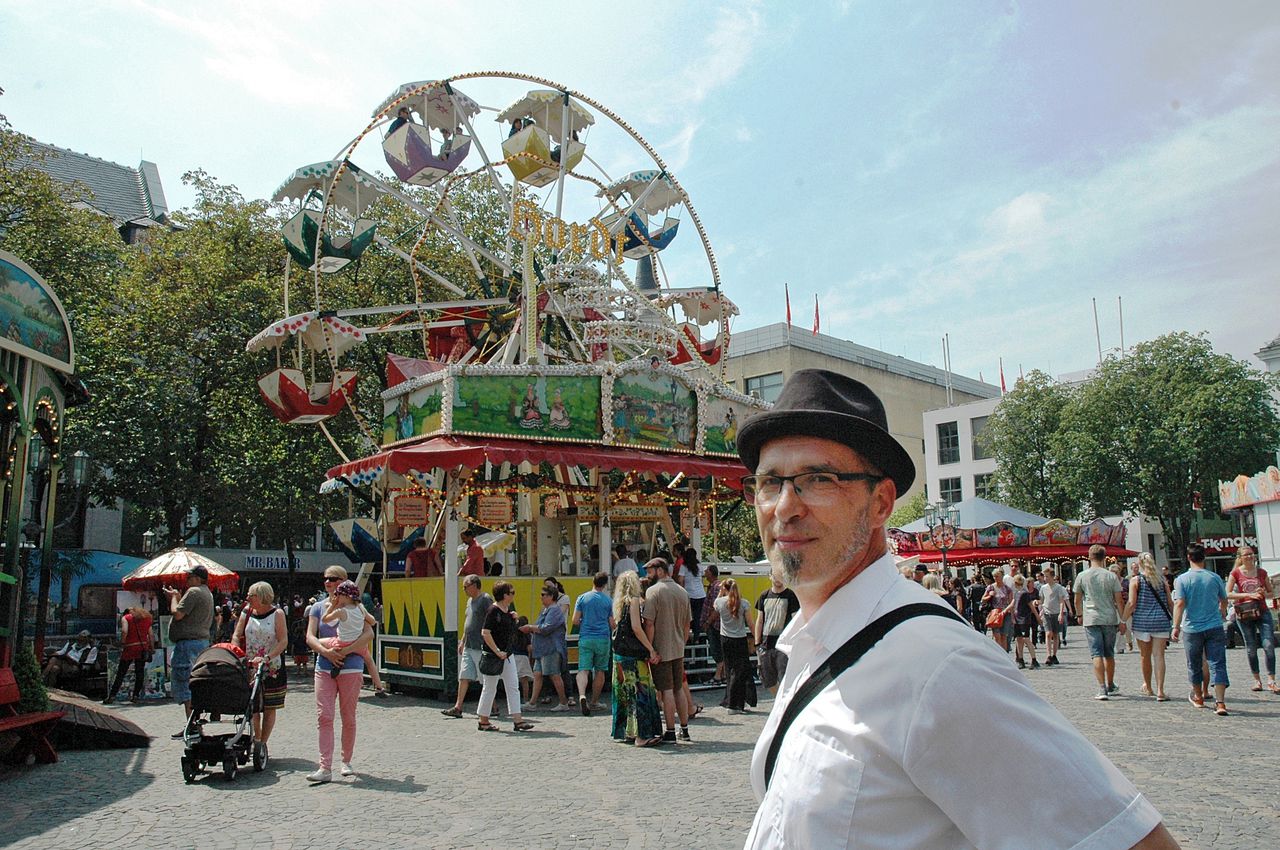 Beim Gang über den historischen Teil von "Pützchens Markt" in Bonn blickt der Mann mit dem schwarzen Hut als Erkennungszeichen regelmäßig aufs Smartphone. Hier sind alle Kontaktdaten seiner Gemeinde erfasst. Im Vorbeigehen schwärmt Heinrich von pittoresk bemalten Karussells und Zuckerwatteständen. Hier ein Händedruck mit einem Schausteller, den er von anderen Kirmesorten kennt, dann ein fast jungenhafter Blick hinüber zu den Autoskootern. Jetzt muss erst einmal Chefin Astrid Müller an der Kasse begrüßt werden.