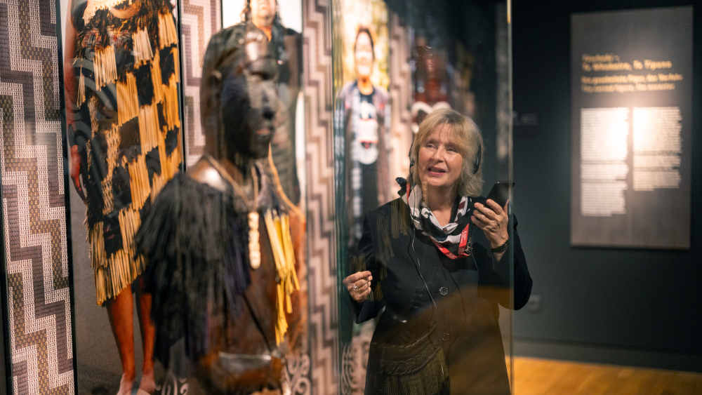 Für ihre Gäste lässt sie nun erst mal den Prachtboulevard der Münchner Maximilianstraße lebendig werden, an dem das Museum mit seiner Skulpturenfassade liegt, gesäumt von Kastanien und Rosenbeeten. In der Maori-Ausstellung sorgt die Ozeanien-Expertin dann für noch viel mehr Bilder in den Köpfen: In den Gedanken der Zuhörer tauchen reich verzierte Keulen aus Stein auf, mit einer Trageschnur „wie bei einem Taschenregenschirm“, kunstvolle Schmuckschatullen aus Holz nehmen Gestalt an, „geformt wie ein Bootskorpus mit Deckel, über und über mit geschnitzten Kerben und Spiralen bedeckt“. Hörbeispiele von Maori-Gesängen und Naturgeräuschen runden das Ausstellungs-Erlebnis per Telefon ab.