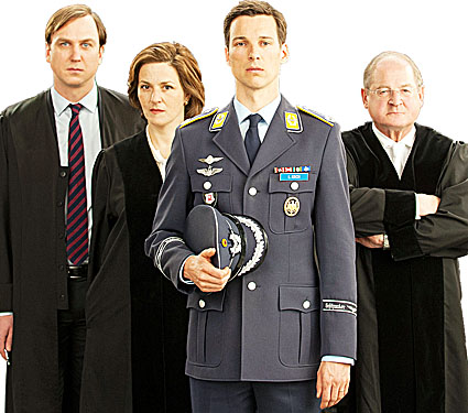 Zwei Piloten der Luftwaffe versuchten vergeblich, das Flugzeug abzudrängen. Obwohl sie keinen Befehl erhielten, das Flugzeug abzuschießen, schoss ein Pilot dennoch. 164 Menschen kamen ums Leben, nun muss sich Major Lars Koch (Florian David Fitz als schneidiger Elite-Soldat), wegen Mordes vor Gericht verantworten.