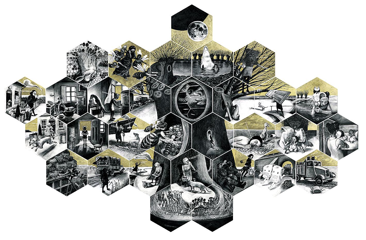 Das ist es, was Feuchtenberger selbst ihrem Werk an Geschichten zuordnet. Der unvoreingenommene Betrachter wird vieles davon nicht erkennen. Er wird die Paral-lelen zum mittelalterlichen Altar sehen, etwa im Aufbau des Bildes oder in den Soldatenfiguren. Er kann die vereinzelt eingefügten Textzeilen lesen und etwa die Bienen als Kriegsflugzeuge deuten. Und er weiß vielleicht, dass den Bienen bis ins Mittelalter eine „jungfräuliche Geburt“ zugesprochen wurde, weil die Menschen nicht wussten, dass die Königin außerhalb des Bienenstocks beim Hochzeitsflug begattet wird.