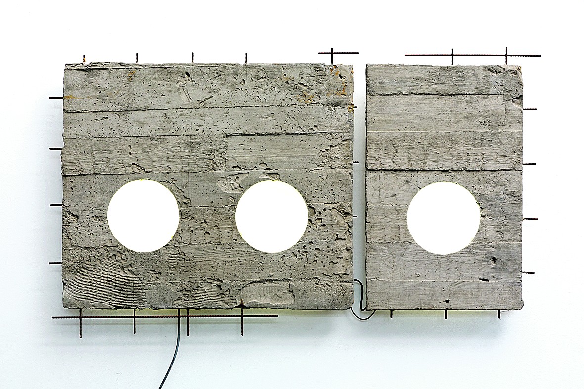 In der Tat zeigt sich das etwa an dem Wandobjekt „2+1“, einer von vier gezeigten Arbeiten des Kölner Künstlerduos molitor & kuzmin. Es besteht aus zwei rohen Schalbetonplatten, in die drei beleuchtete bullaugenförmige Öffnungen eingearbeitet sind. Im Kirchenraum wecken sie Assoziationen an die Dreieinigkeit von Gottvater, Sohn und Heiliger Geist, die hier allerdings einen Bruch erfährt. Wer von dreien sich hier abtrennt und warum, kann man sich fragen.