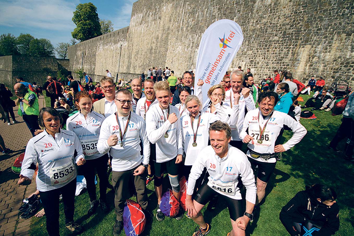 Diesmal gab es eine Besonderheit: Die Lippische Landeskirche hat 95 Sportlerinnen und Sportlern die heißbegehrten Teilnehmerplätze gesichert – im Gegenzug trugen die Läuferinnen, Läufer, Wanderer und Nordic Walkerinnen ein Laufshirt mit dem Motto „gemeinsam frei“, unter dem in Lippe das Reformationsjubiläum gefeiert wird. Am Zieleinlauf gratulierten Landessuperintendent Dietmar Arends (3. von links) und Sportpfarrer Holger Postma (hinten, links neben der Flagge) zur herausragenden sportlichen Leistung.