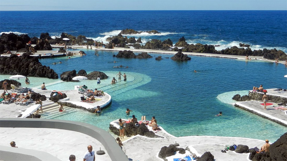 Nach kurzer Überlegung, ob ein Jobwechsel für uns infrage kommt, entscheiden wir uns nach den Wanderstrapazen dafür, erst mal ein Stück weiter zum nördlichsten Zipfel zu fahren. Wir möchten die natürlichen Felsenbecken sehen, wo die betäubten Fische gefangen wurden: in Porto Moniz. Überraschung Nummer 203, heute sind diese Becken ein Meeresschwimmbad! Die in die bizarren Felsformationen gemauerten Becken werden von den wilden Wellen mit kristallklarem Meerwasser geradezu geflutet: was sichtlich für jede Menge Spaß und Aufregung bei den Planschenden sorgt. Glücklicherweise streut niemand mehr Gift oder käschert Badende heraus. Also: hinein in die Fluten, als hätte es heute noch nicht genug Wasser gegeben.