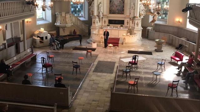 Rund 20 Minuten dauert die Feier am Sonntag Cantate. Ein Fest für den Gesang, ohne Gesang. Denn der ist in geschlossenen Räumen wie einer Kirche nicht erlaubt. Dafür singen die Vögel vor den weit geöffneten Kirchentüren. Ihr Gezwitscher vermischt sich mit dem Rauschen des Verkehrs und dem Klavierspiel von Kantor Igor Zeller.
