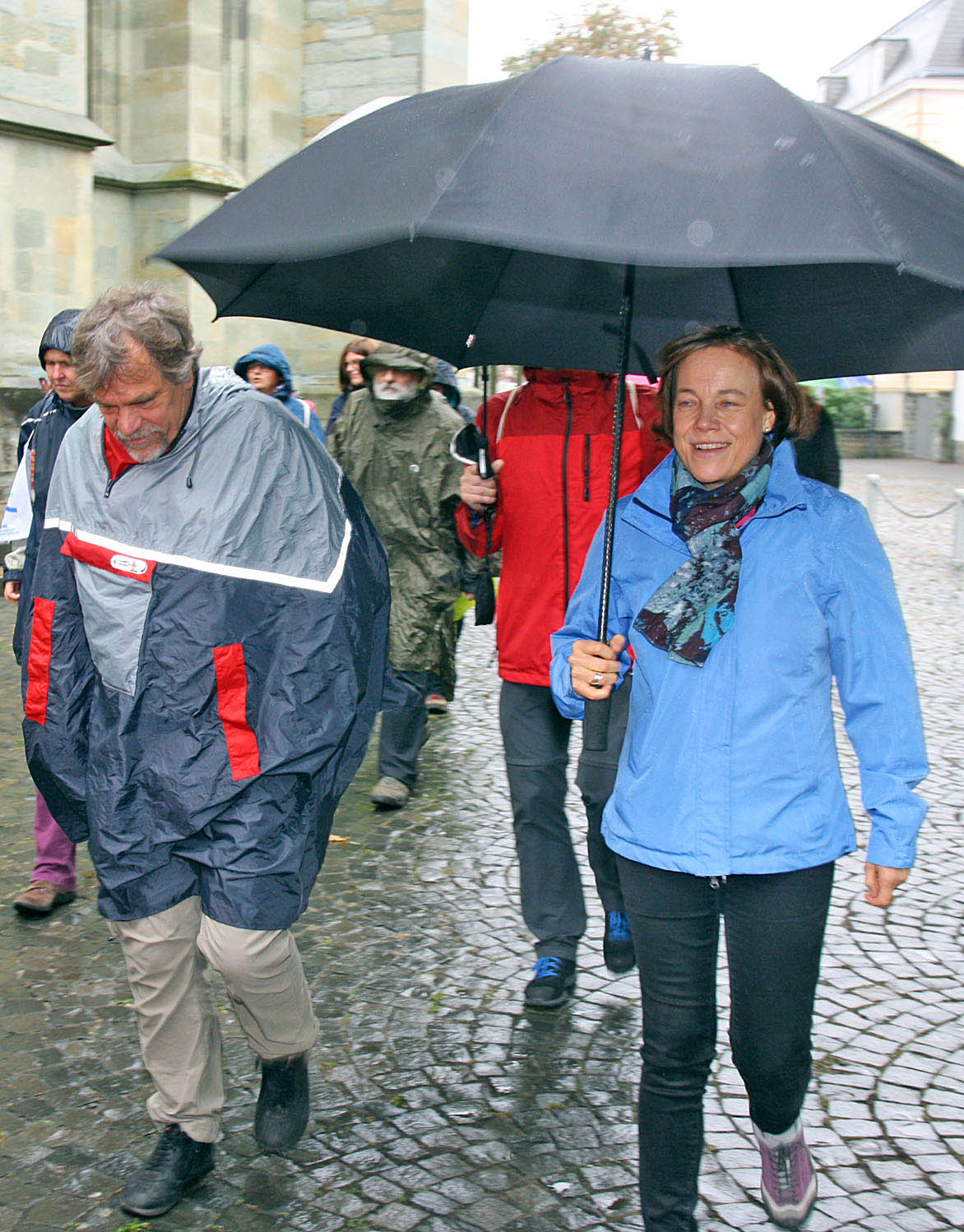 SOEST – „Herrlich“, schwärmt der Bannerträger und lobt den prasselnden Landregen, der pünktlich einsetzt, als sich die gut 30 Klimapilger von der Wiesenkirche in Soest aus auf den Weg machen. Pfarrer Kai Hegemann begleitet die Pilger zu ihrer nächsten Station nach Lippstadt. Mit auf den Weg macht sich auch Präses Annette Kurschus, die leitende Geistliche der Evangelischen Kirche von Westfalen.Zum optimistischen Appell „Geht doch!“ sind die Christinnen und Christen verschiedener Konfessionen unterwegs, um für eine Einzeletappe, für eine längere Strecke oder sogar auf der insgesamt 1700 Kilometer langen Tour ihre Freude am Pilgern mit dem Einsatz für Klimagerechtigkeit und Klimaschutz zu verbinden.