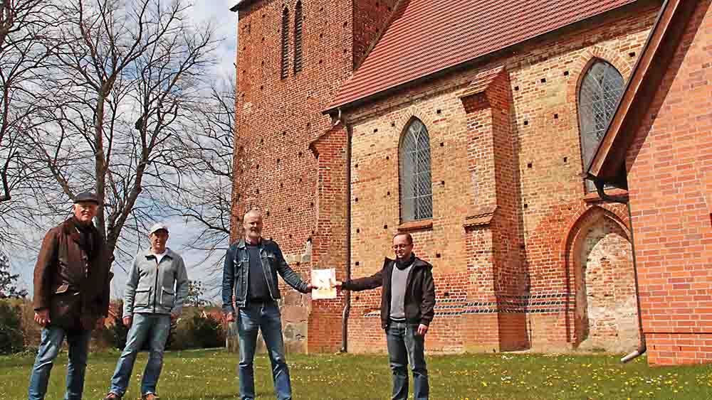 Für die interessierte sich natürlich auch der Fördervereinsvorsitzende und wenn möglich für das entsprechende Baumaterial. Weil der Nabu sowieso eine erneute Spendenaktion dafür ins Leben rufen wolle, werden sie auch Jesendorf mit Bauanleitung und wenn möglich Material versorgen, so Manuela Heberer. „Dann werden wir in der Kirche, so es wieder möglich ist, eine gemeinsame Bauaktion in der Kirche veranstalten“, zeigt sich Martin Maercker von der Idee begeistert. Letztlich halten André Gieseler und Martin Maercker die Plakette neben die Kirchentür. „Ja, hier könnte sie hängen“, freuen sie sich.