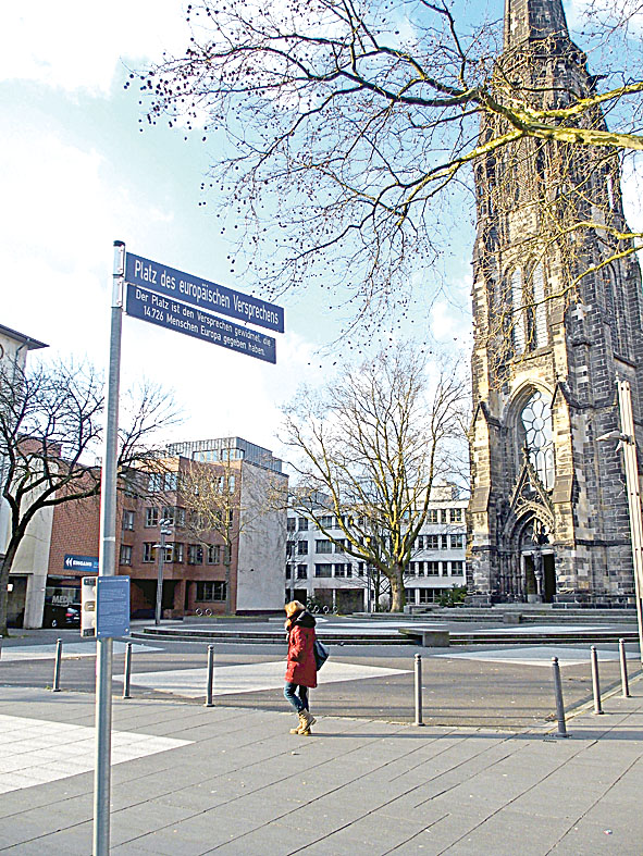 Europa ein Versprechen geben – das war auch die Kernidee des Bochumer „Platz des europäischen Versprechens“. 14 726 Unterschriften von Bürgerinnen und Bürgern eingraviert auf neun Steinplatten direkt vor der Bochumer Christuskirche im Stadtzentrum der Ruhrgebietsmetropole. Ein Projekt des Kirchenkreises Bochum, das 13 Jahre bis zu seiner Realisierung brauchte. Doch genau diese vielen Versprechen sind heute bedroht.