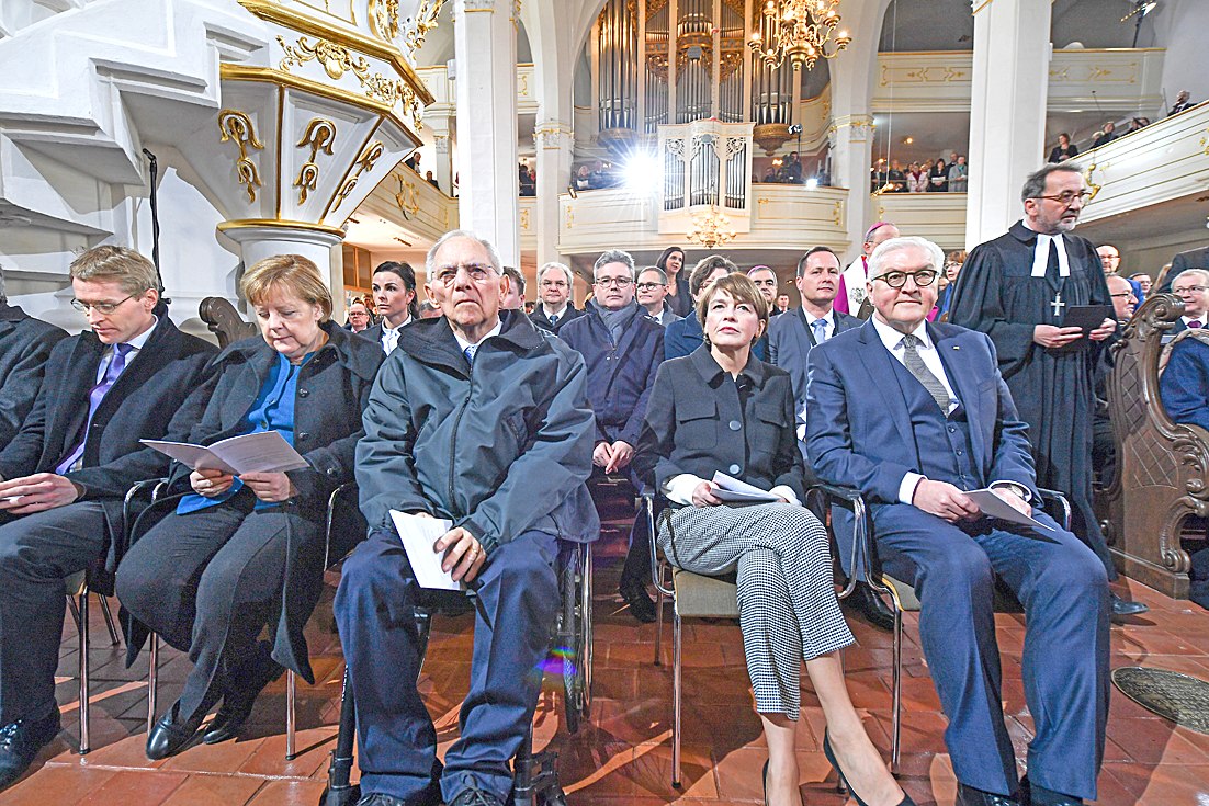 Vor mehreren hundert Gästen, darunter Bundespräsident Frank-Walter Steinmeier und Bundeskanzlerin Angela Merkel (CDU), erinnerten sie an die „mutigen Frauen und Männer“, die nach dem Ersten Weltkrieg und dem Ende des Kaiserreiches in Weimar die Verfassung einer freiheitlichen Demokratie entwarfen.