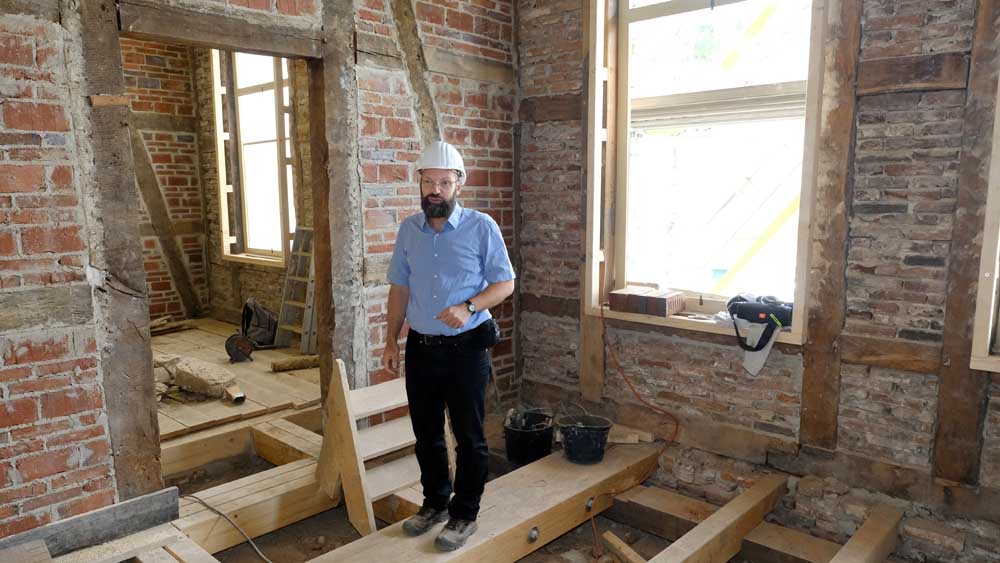 Für die Generalüberholung haben Handwerker die Mauern der Anlage freigelegt. “Im Erdgeschoss ist Mittelalter, darüber setzt der Barock auf”, erläutert Oliver Wolf. Dabei kamen Schäden zum Vorschein, die von außen nicht sichtbar waren: Im Fachwerk hatte sich Hausschwamm eingenistet. Pilze und Käfer zersetzten das Gebälk. Auch Feuchtigkeit drang ein und führte zu Fäulnis.