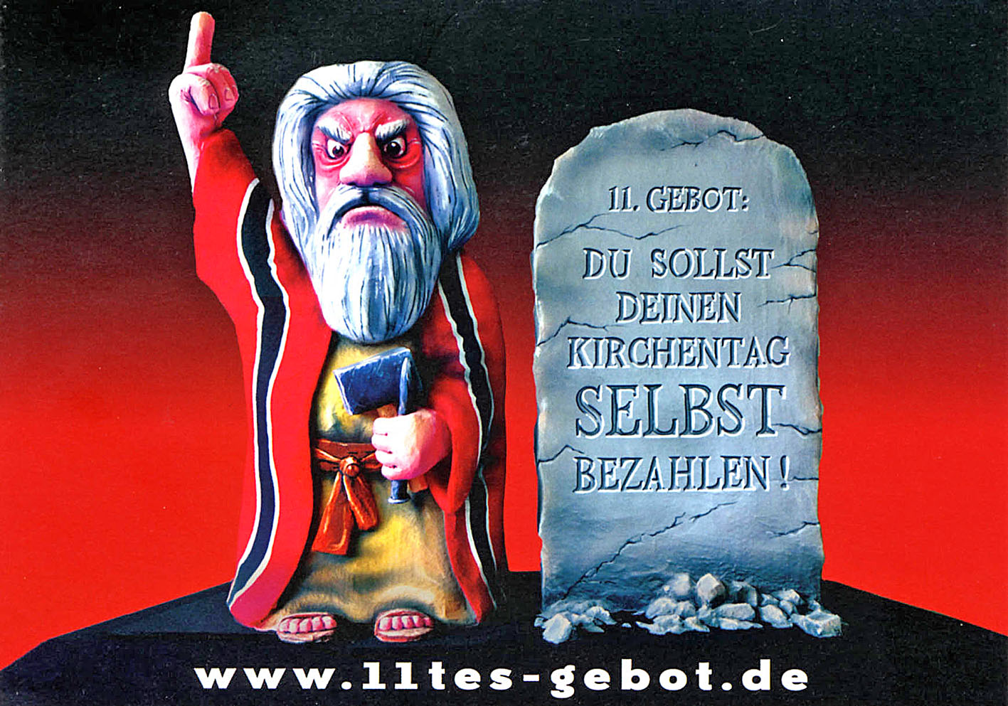 Strikt dagegen sind Religionskritiker, die in der Dortmunder Innenstadt eine meterhohe Moses-Figur aufgestellt haben, daneben ein Schild mit dem 11. Gebot: „Du sollst Deinen Kirchentag selbst bezahlen!“ (siehe Kommentar S. 5).