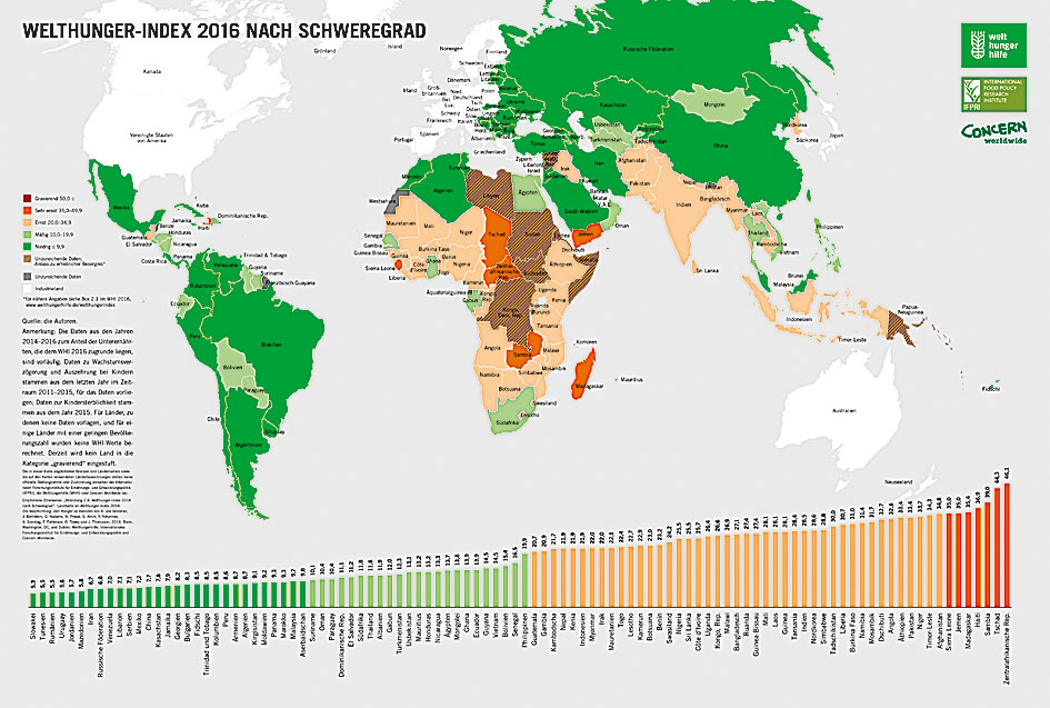Aufgrund unvollständiger Daten konnte der WHI-Wert in diesem Jahr für 13 Länder nicht errechnet werden. Bei Betrachtung der vorliegenden Daten und Berichte sei aber davon auszugehen, dass die Lage in zehn dieser Länder Anlass zu ernster Besorgnis gebe, sagte Klaus von Grebmer vom International Food Policy Research Institute in Washington (IFPRI). Dabei handelt es sich um Syrien, Burundi, die Demokratische Republik Kongo, Eritrea, die Komoren, Libyen, Papua-Neuguinea, Somalia, den Sudan und den Südsudan. Das IFPRI hat gemeinsam mit der Welthungerhilfe und der Hilfsorganisation Concern Worldwide den diesjährigen Bericht erstellt.