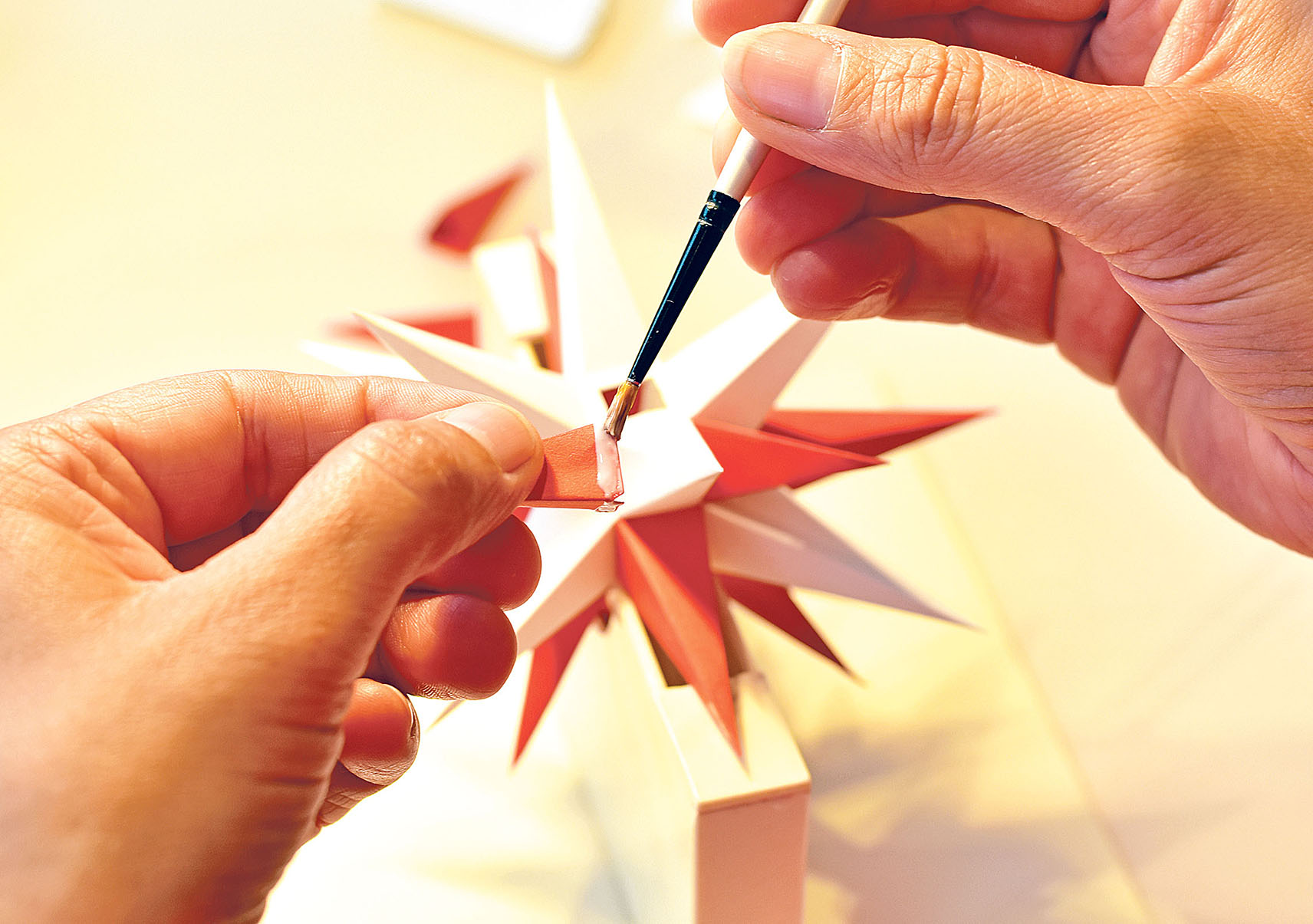 Die Manufaktur für den berühmtesten Stern der Welt hat das ganze Jahr Saison. Leimen, Falten, Kleben: Unter flinken Händen entstehen Zacke für Zacke die Spitzen für den „Herrnhuter“. Claudia Bachmann und Michaela Tzschoppe haben dafür einen Rhythmus entwickelt. Bis zu 3500 Zacken schaffen sie zu zweit an nur einem Tag. Tzschoppe streicht den Leim auf den Papprahmen, Bachmann formt in einer metallenen Vorrichtung aus einem Kegel eine Zacke und drückt das Sternepapier am Rahmen fest. Die Arbeitsaufgaben im Duo der sogenannten Rähmchenkleber werden nur selten getauscht. „Was man immer macht, macht man am schnellsten“, ist Tzschoppe sicher. Leimen, Falten, Kleben.