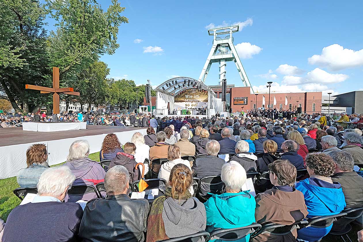 Beim Abschlussgottesdienst vor dem Deutschen Bergbaumuseum hielten Landesbischof Heinrich Bedford-Strohm und Kardinal Reinhard Marx die Predigt im Dialog. Bedford-Strohm wünschte sich, dass der Weg der beiden Konfessionen weiter aufeinander zuführt. „Wir leben aus der Kraft der Gemeinschaft. Weil Christus für uns auferstanden ist, kann uns die Sorge um die Zukunft nicht die Hoffnung nehmen.“