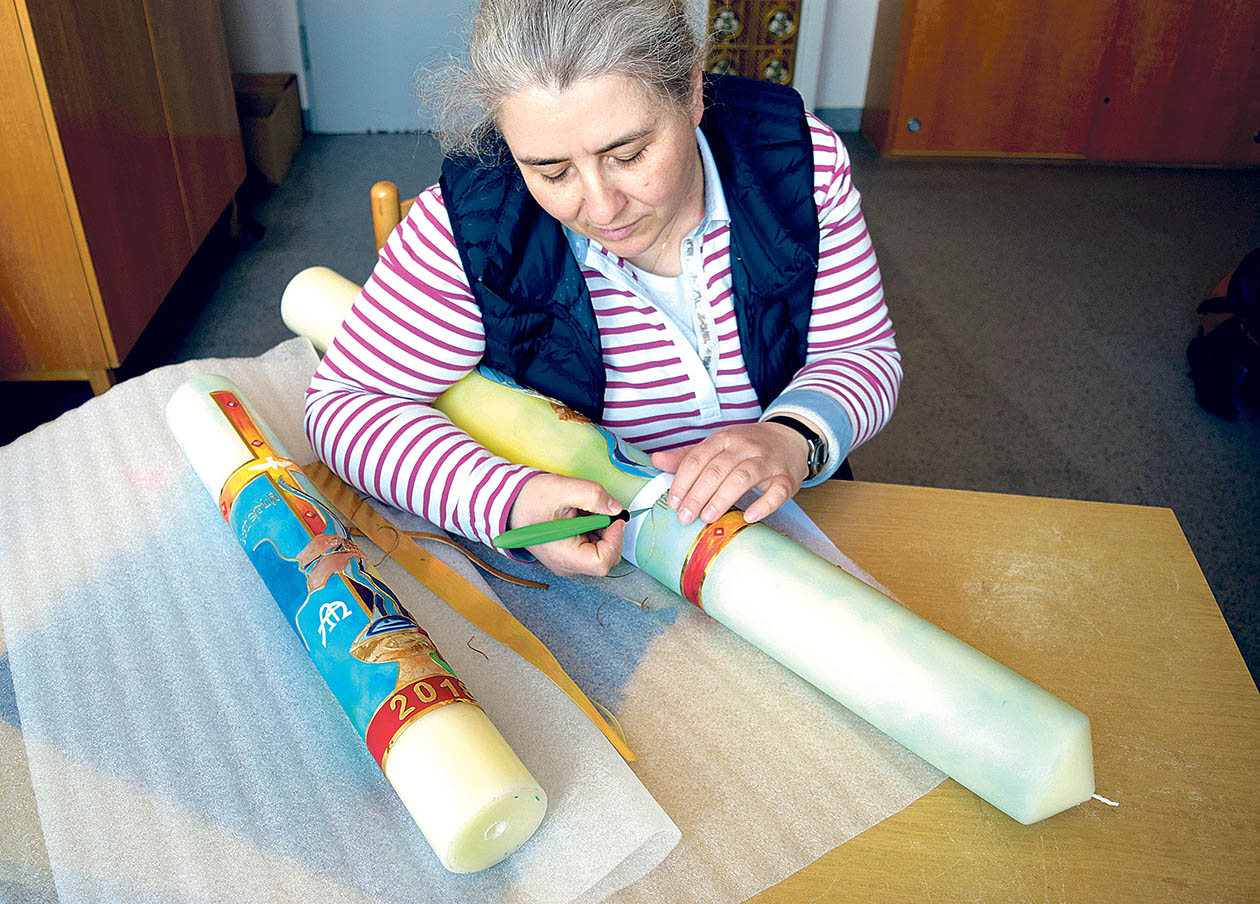 Für mich, als gläubige Christin, ist die Gestaltung der beiden Osterkerzen immer wieder Ausdruck meines Glaubens. Die ersten Osterkerzen gestaltete ich vor vielen Jahren mit Jugendlichen in der Fastenzeit. Mit den Jahren wuchs in mir die Begeisterung des kreativen Schaffens mit Wachs auf den Kerzen, gerade für glaubensstarke Motive. Mein Theologiestudium sowie mein gelebter Glaube im Alltag und die unendliche Liebe Gottes sind mir dabei eine große Unterstützung. Kerzen gestalten ist für mich eine Art Lebenselixier.