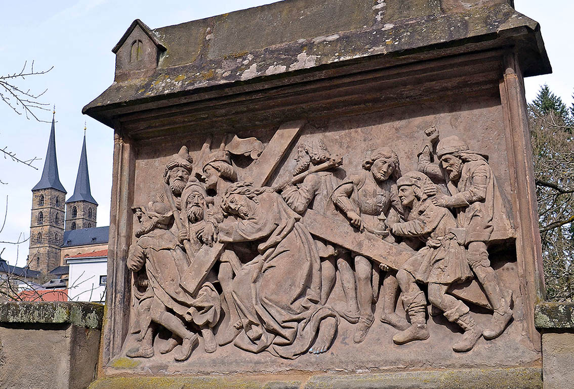 Die vielgestaltigen Darstellungen der Steinreliefs, die den Weg vom Haus des Pilatus‘ zum Kalvarienberg illustrieren, überraschen durch ihre Ausdrucksstärke. Immer beleben mindestens ein halbes Dutzend Figuren die Szenen. Sie sollen nach Vorlagen des Künstlers Wolfgang Katzheimer entstanden sein, der in Bamberg wirkte – meist im Auftrag der Bischöfe. Als Schöpfer vermutet man den Bildhauer Adam Kraft, der den stilistisch ähnlichen Nürnberger Kreuzweg geschaffen hatte.