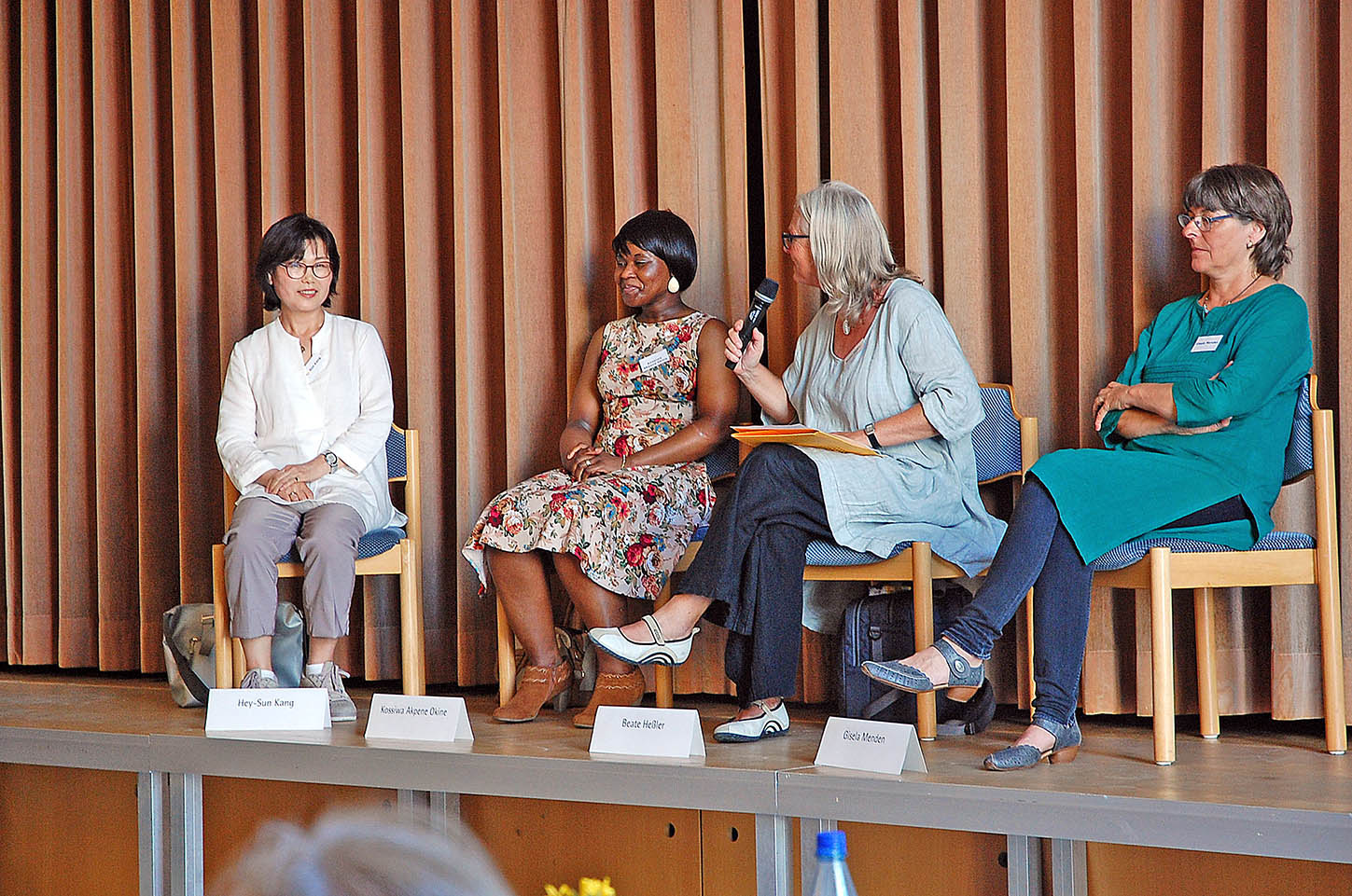 Nach den Workshops kamen die Frauen noch einmal zu einem Podiumsgespräch zusammen. Beate Heßler, Pfarrerin im Amt für MÖWe, interviewte Kossiwa Akpene Okine aus Togo, Hey-Sun Kang aus Südkorea sowie Gisela Menden von Oikocredit. Gutes Leben für alle, so resümierten die verschiedenen Frauen mit unterschiedlichen kulturellen Prägungen, setze sich aus vielen Facetten zusammen. Aber entscheidend sind nach ihren Worten: Gesundheit, Bildung, Gerechtigkeit, Frieden, ein soziales Miteinander und die eigene, lebendige Beziehung zu Gott.