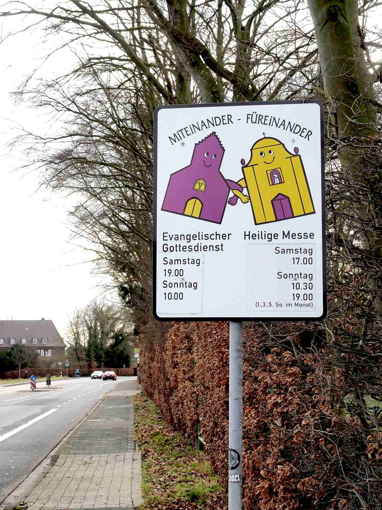 „Es ist ein Stück Öffentlichkeitsarbeit“ sagt Pfarrer Ralf Groß. „Diese Schilder sind ein Willkommensgruß. Es ist gut, wenn die Kirchen zeigen, dass sie da sind und etwas im Angebot haben.“ Inzwischen werden immer öfter ökumenische Schilder aufgestellt, etwa in Burgsteinfurt (siehe großes Foto). „Auf einem ökumenischen Gemeindefest entstand die Idee, ein ökumenisches Straßenschild zu gestalten und aufzustellen“, erzählt Guido Meyer-Wirsching. Pfarrer in Burgsteinfurt. Gesagt, getan. „Das kommt gut an – gerade der ökumenische Aspekt. Wir als Kirche sollten gut erkennbar sein und uns zeigen.“
