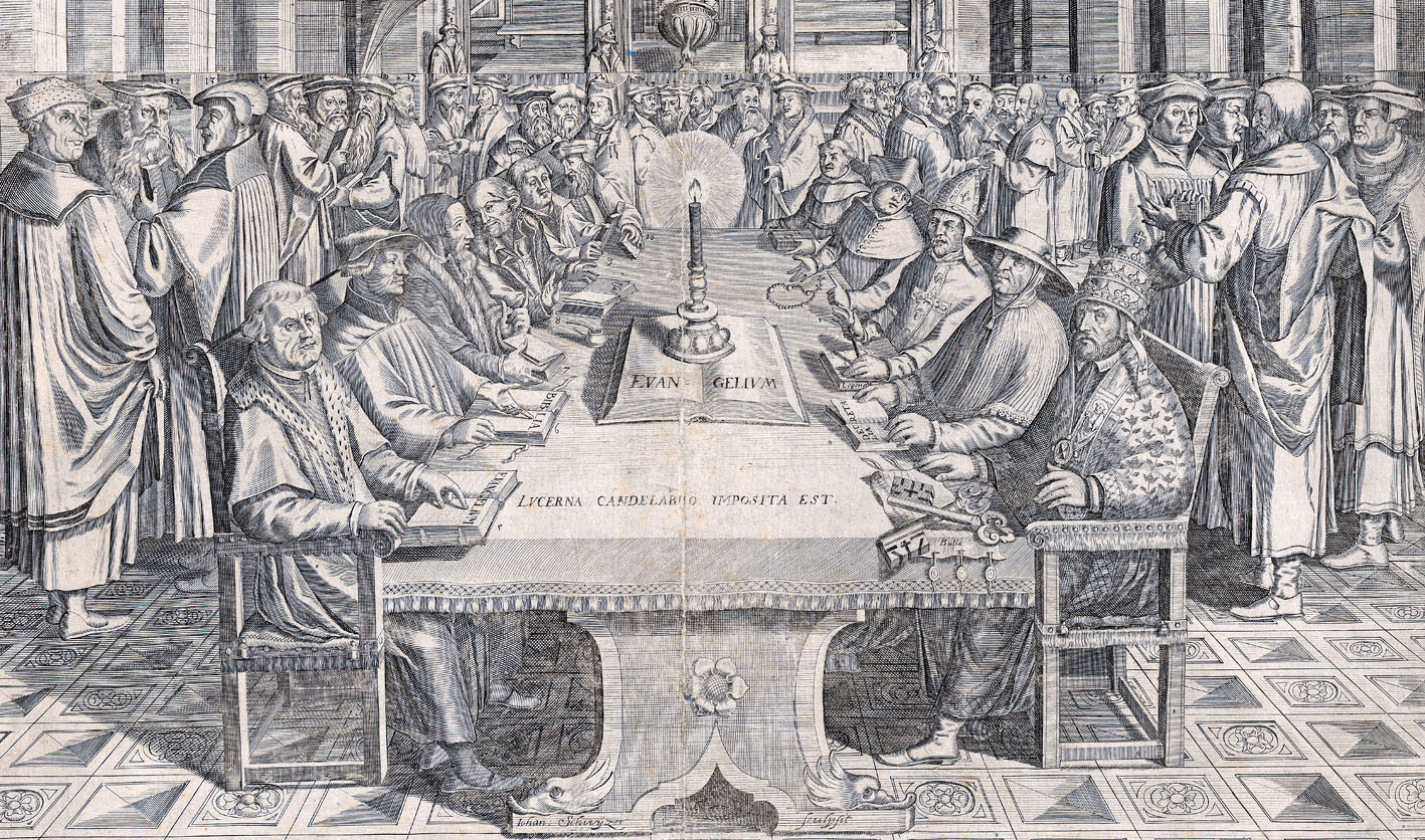 Nicht nur Luther, sondern auch (von links) Zwingli, Calvin, Melanchthon, Bugenhagen und Oecolampad – so stellte sich der Künstler 1650 ein fiktives Gespräch mit Vertretern der katholischen Kirche vor.