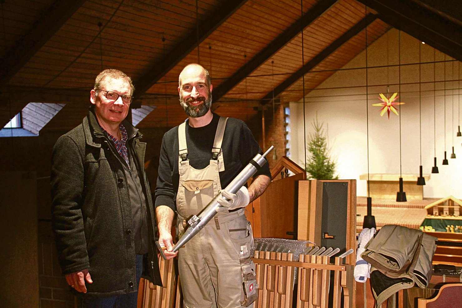 „100 015 Euro sind bis heute zusammengekommen“, sagt der Pfarrer. Seit Anfang Juli wurden die Gottesdienste im nahen Gemeindezentrum begangen, die Arbeiten gingen gut voran. Gerade noch ist Orgelbauer Mathias Johannmeier damit beschäftigt, die letzten der gereinigten Orgelpfeifen in das Instrument einzubauen.