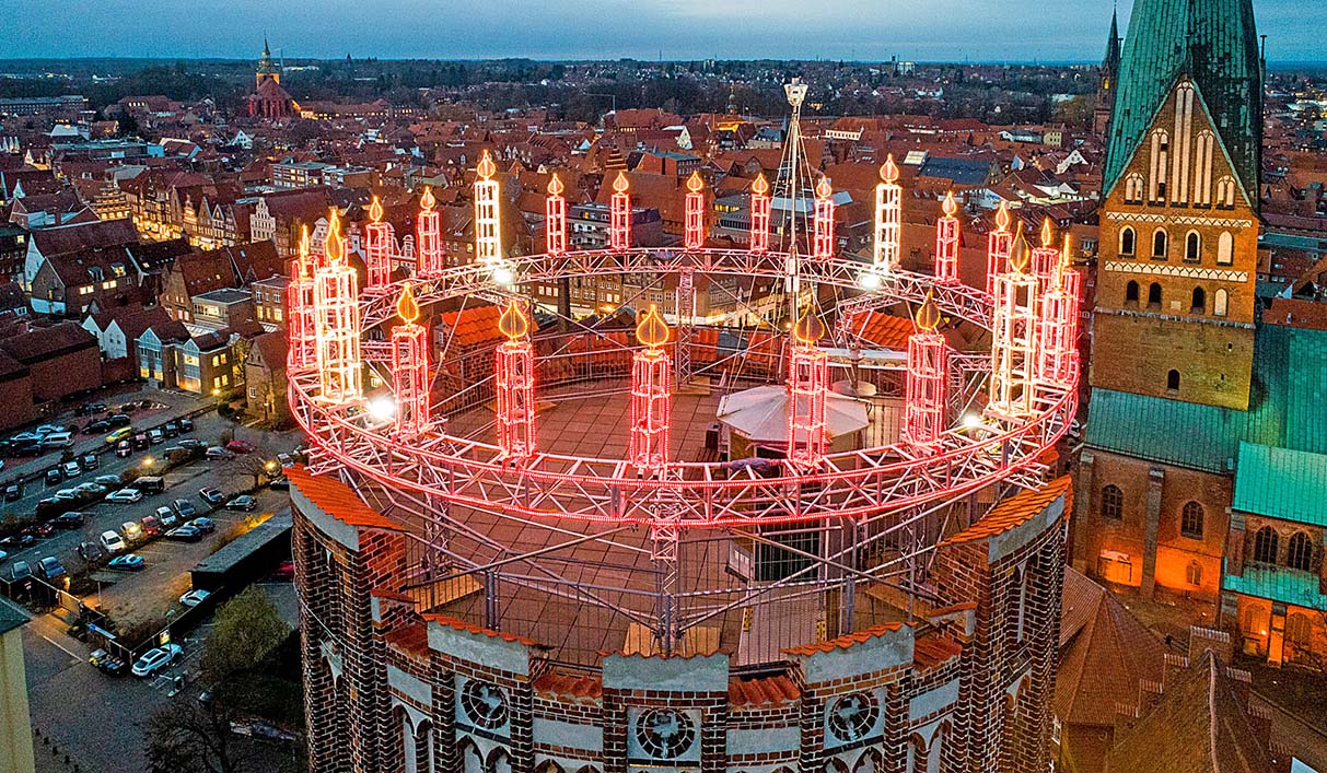 Ein riesiger Adventskranz (im Bild bei der Lichtprobe) wirbt erneut in Lüneburg aus luftiger Höhe um Spenden für Kinder. Ein Kran hievte den anderthalb Tonnen schweren Aluminium-Ring mit elektronischen Kerzen auf den historischen Wasserturm. Ab dem ersten Advent erstrahlt das Lichtobjekt in 56 Metern Höhe über der Hansestadt, wie der Kirchenkreis Lüneburg mitteilte. Der Kranz bleibt nach Angaben von Projektleiter Michael Elsner bis zum 6. Januar täglich in den Morgenstunden und von 16 Uhr bis Mitternacht illuminiert. Jeden Tag wird eine neue Kerze „angezündet“. Spender können den Lichterkranz per SMS mit dem Wort „LICHT“ an die Nummer 83090 für jeweils einige Sekunden zusätzlich erhellen. Jede SMS bringt 1,27 Euro an Spenden ein. Auch unter Telefon (0 90 03) 9 42 43 76 kann er erleuchtet werden.