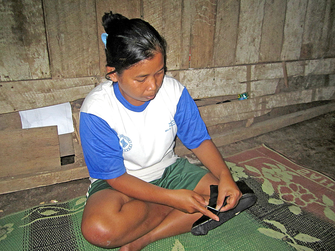 Rima* näht. Sie näht mit der Hand das Oberleder auf eine Schuhsohle. Sie tut dies zu Hause, in ihrem Dorf, in der Nähe der Stadt Ungaran in Nord-Java / Indonesien. Rima ist eine der über 500 Heimarbeiterinnen des deutschen Schuh-Herstellers ARA. Alle anderen Produktionsschritte finden in einer Fabrik statt, die ARA dort betreibt. Hier werden von rund 2000 Menschen jeden Tag 8000 Paar Schuhe hergestellt.