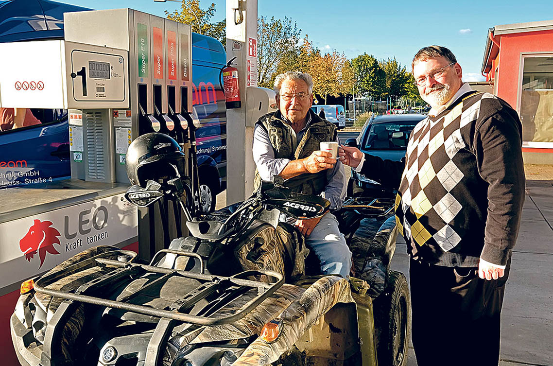 Mit einem laut knatternden Quad fährt der 84-jährige Gustav Gropengießer an der Tankstelle im Harzer Dorf Pöhlde vor. An der Zapfsäule erwartet ihn schon der evangelische Pastor Andreas Schmidt: „Darf ich Sie auf Kirchenkosten auf einen Kaffee einladen?“ Der Rentner schaut überrascht, wie so viele an diesem Nachmittag. Eigentlich will er nur schnell tanken und seinen Benzinkanister auffüllen. Nach kurzem Zögern aber nimmt er an und setzt sich auf einen der Gartenstühle in die Nachmittagssonne.