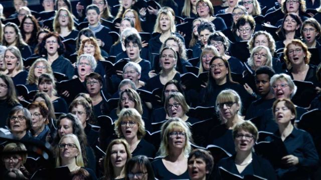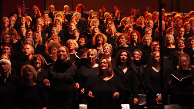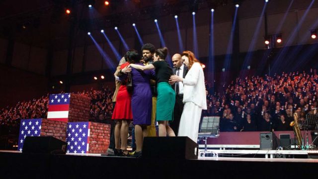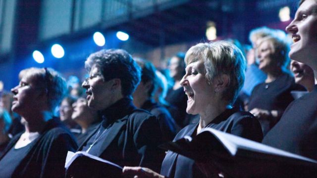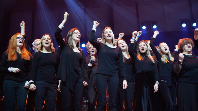 “Wir haben nicht damit gerechnet, dass sich so viele Leute finden lassen”, sagt Hanjo Gäbler, der zusammen mit Christoph Terbuyken die 22 Lieder der Show komponiert hat. Gäbler meint die 1.164 Chormitglieder, die auf der Tribüne im Hintergrund mitsingen und sich dabei zu Gospel-Tönen, Rock ‘n’ Roll und Popmusik sanft im Rhythmus wiegen. Am Handgelenk tragen sie leuchtende Armbänder, die wie ein Meer aus kleinen bunten Lichtern wirken. Auf der bundesweiten Tournee wird der Mega-Chor an jedem neuen Ort neu zusammengestellt. An der Aufführung in Hannover beteiligten sich 34 Chöre und 234 Einzelsänger aus der Region, unter den Zuschauern sind auch Landesbischof Ralf Meister und Ministerpräsident Stephan Weil.