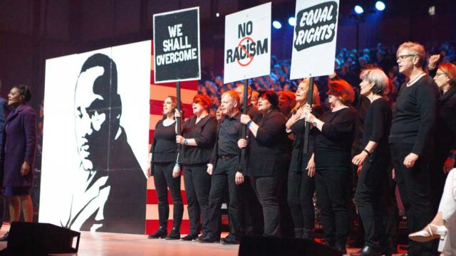 Hannover/Witten. Eine Gruppe schwarz gekleideter junger Menschen stürmt die Bühne. Auf den Plakaten, die sie hoch halten, steht in englischer Sprache “Kein Rassismus”, “Gleiche Rechte” und “Keine Gewalt”. Mit dieser Demo-Szene beginnt in Hannover das Chormusical “Martin Luther King – ein Traum verändert die Welt” über das Leben des US-amerikanischen Bürgerrechtlers.