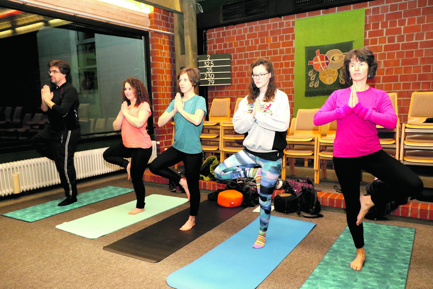 Der Raum sieht inzwischen ganz anders aus: Gut 20 Menschen haben sich mit ihrer Matte einen Platz gesucht. Yoga-Trainerin Pia Wick hat sich vor dem Altar eingerichtet. Sie bittet die Handys auszumachen oder auf lautlos zu stellen. Dann geht es los. Pia Wick gibt Anleitung, wie man sitzen soll. „Wir singen jetz dreimal Shalom, dann die erste Strophe von ,Gott ist gegenwärtig‘.“