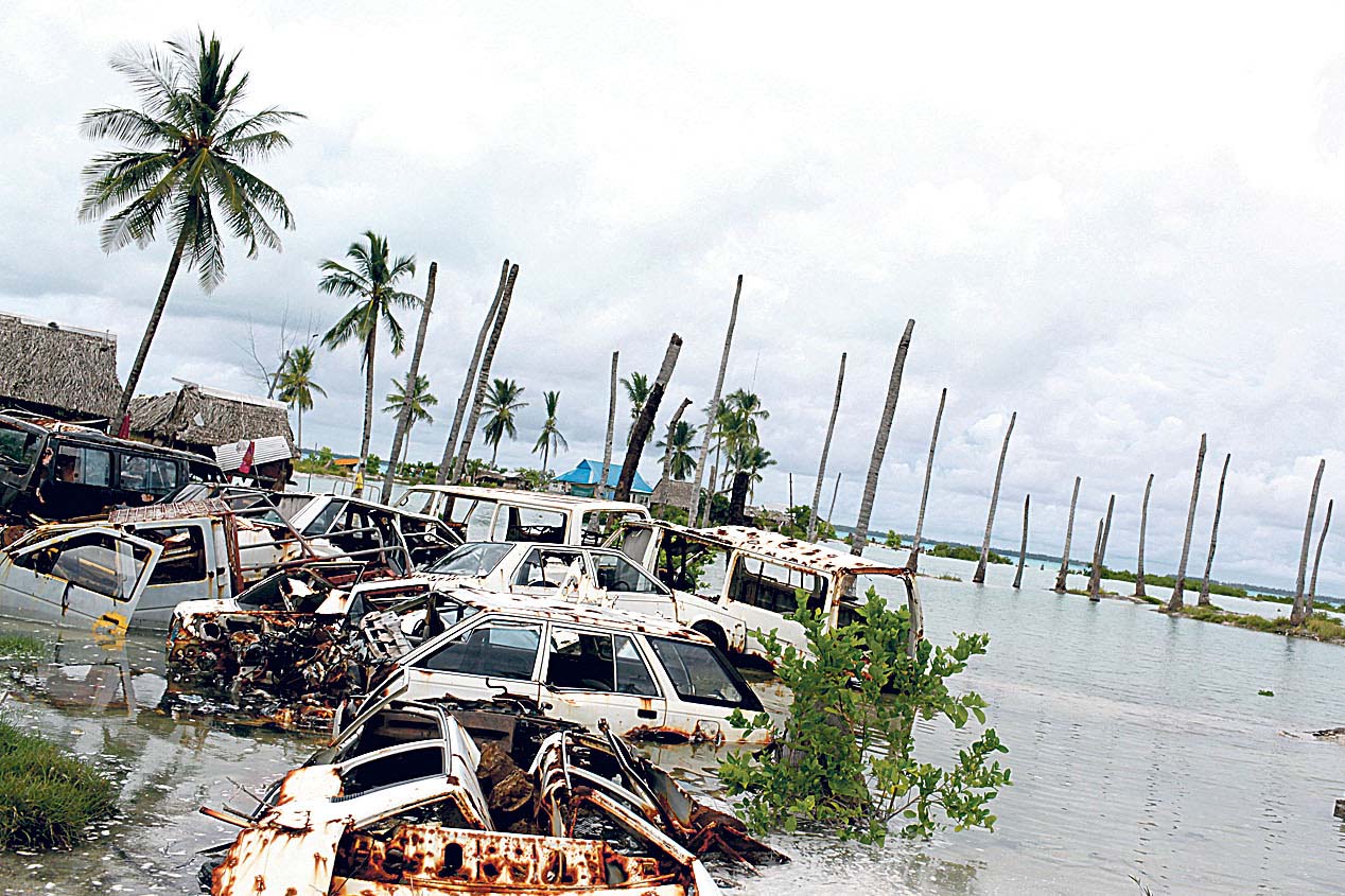Viertens zeigt das Beispiel Fidschi-Inseln, dass von Klimakatastrophen heimgesuchte Länder fast immer mit den Schäden und Verlusten alleingelassen werden, obwohl sie den Klimawandel kaum mitverursachen. So musste Vunidogoloa auf Vanua Levu in Fidschi – als erstes Dorf weltweit aufgrund des Klimawandels – umsiedeln von der Küstenebene auf die bergige Höhe. Ein Drittel der Umsiedlungskosten blieb an den Dorfbewohnern selbst, der Rest an Fidschis Regierung hängen. Manche Pazifikinseln drohen aufgrund des Meeresspiegelanstiegs ganz zu versinken.