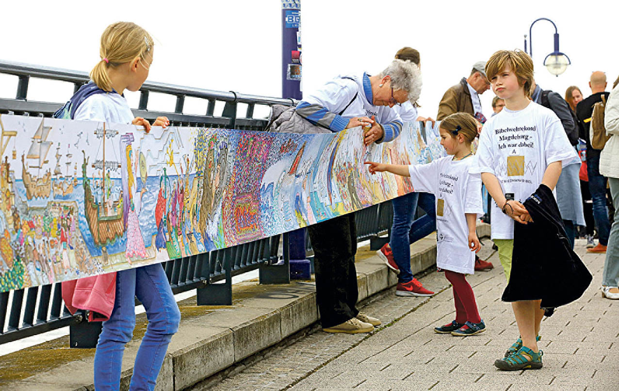 Auf 1517 Meter Länge entfaltet präsentierten 400 Menschen in Magdeburg die wohl längste Bibel der Welt. Das von dem Künstler Willy Wiedmann in 16-jähriger Arbeit geschaffene Werk zeigt in 3333 Illustrationen Szenen aus dem Alten und Neuen Testament